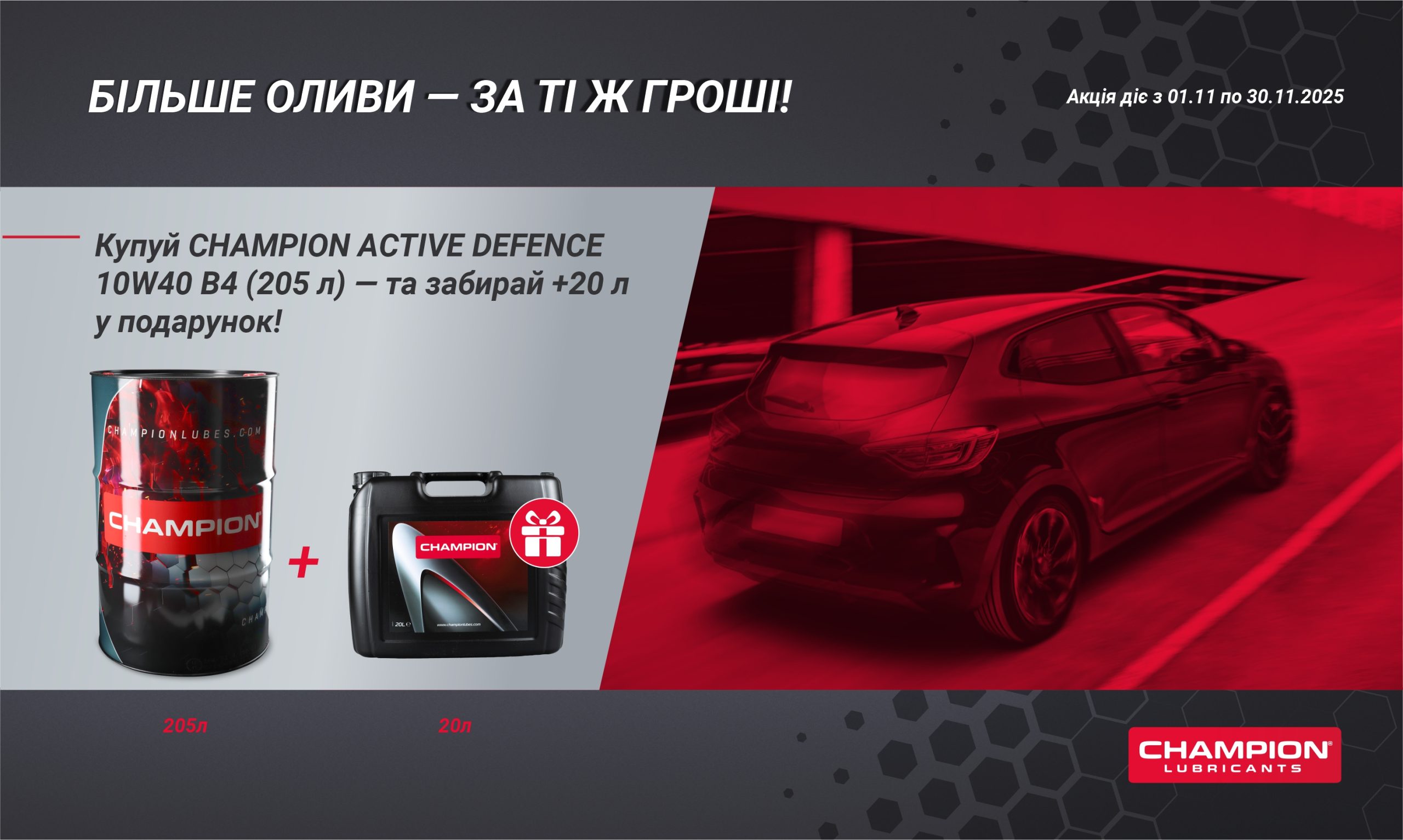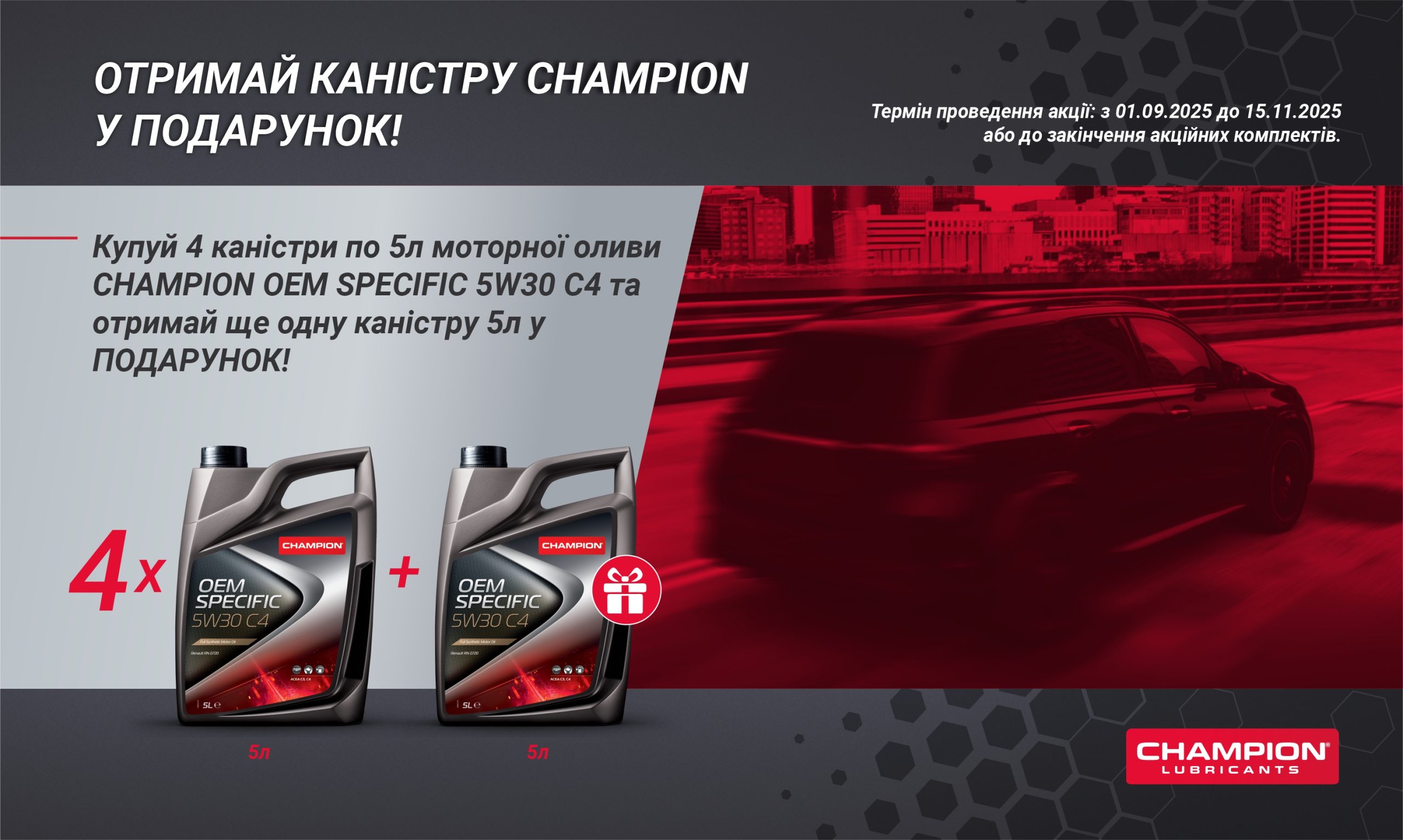 АКЦІЯ! ОТРИМАЙ 20л ОЛИВИ CHAMPION У ПОДАРУНОК